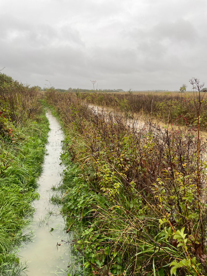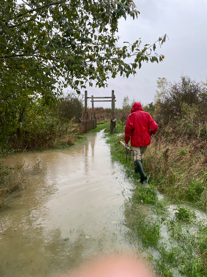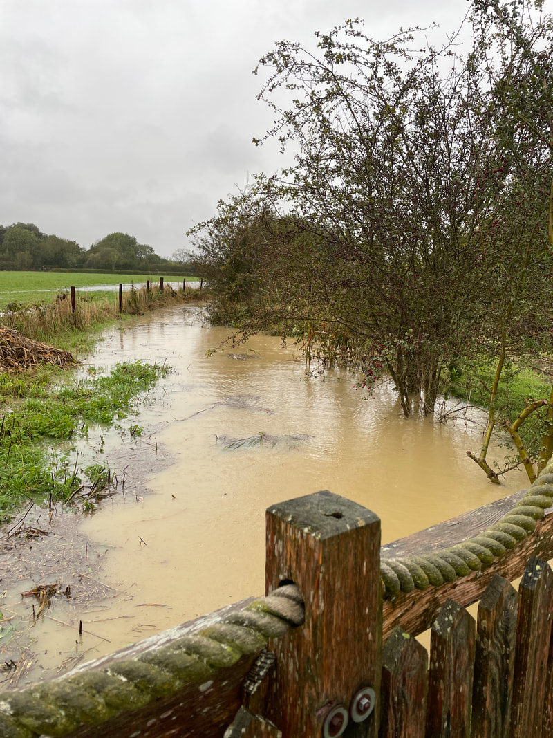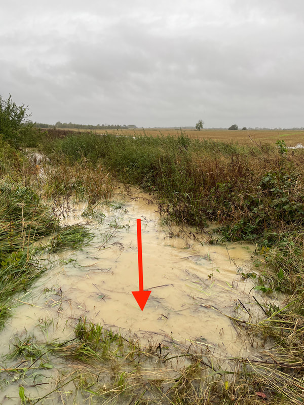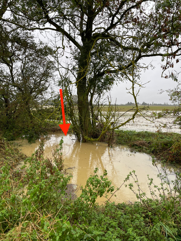 The red arrow is pointing at the position of the entrance into the drain under the field, to the south of the bridleway. It's under at least four feet of water.