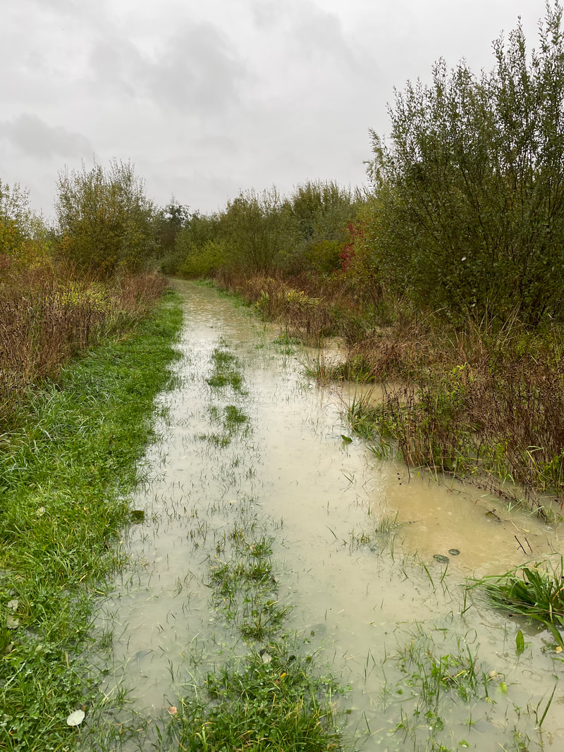 The water is out of the ditch onto the path between Coop Lake and the kissing gate onto the bridleway