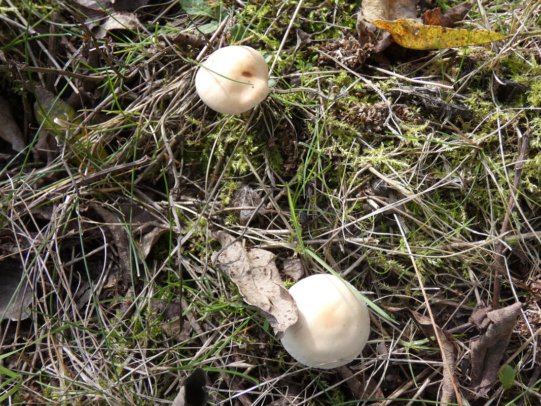Bleached Brittlegill ( Russula exalbicans) in huge numbers under young birch (? ~ 7 y or so) by lake, photo in situ shows the rose-pink...
