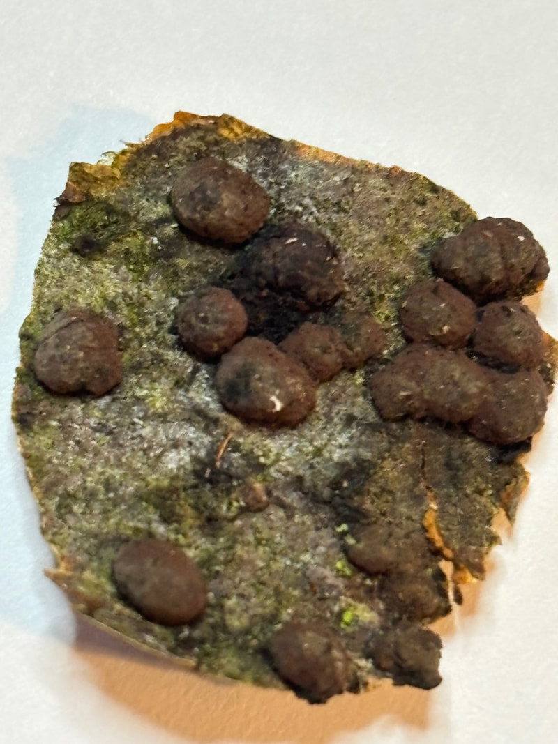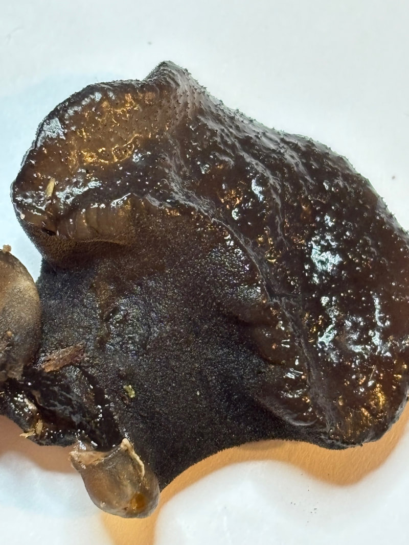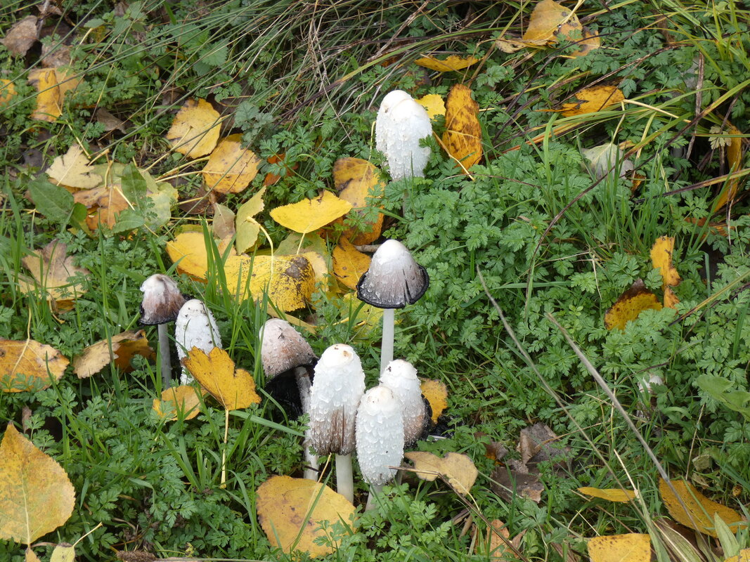 Recent wet and mostly mild weather has allowed particularly wood-dwelling fungi to grow fruiting bodies for spore dispersal. The practice of laying cut branches in piles provides a lot of surface area which also has less latent heat than whole logs so these warm up quickly giving substrate to a number of wood-dwelling saprophytes (organisms that live on decaying matter). We also found one or two less usual species on oak in the older Watt's Wood.