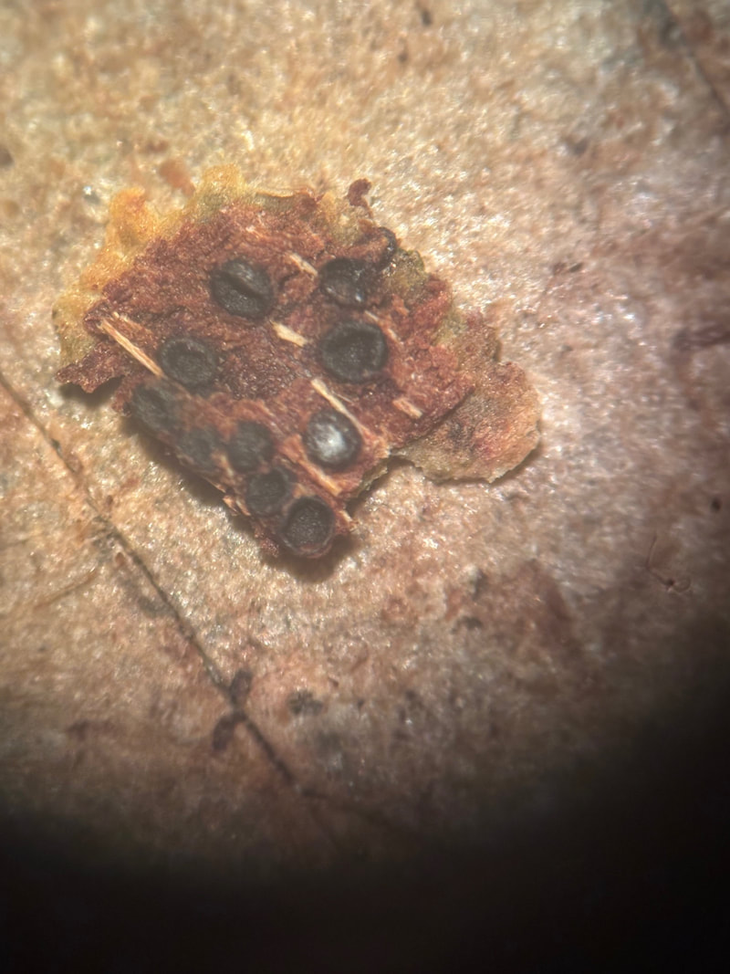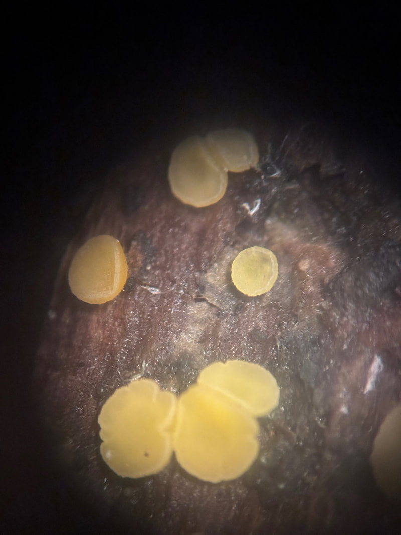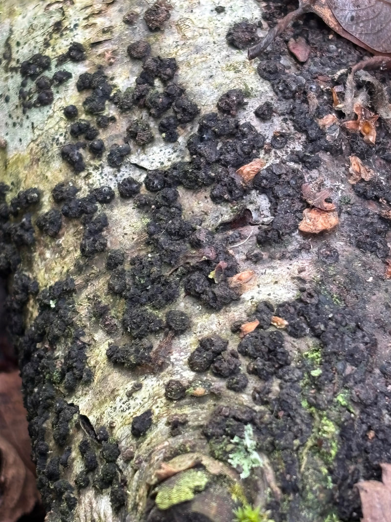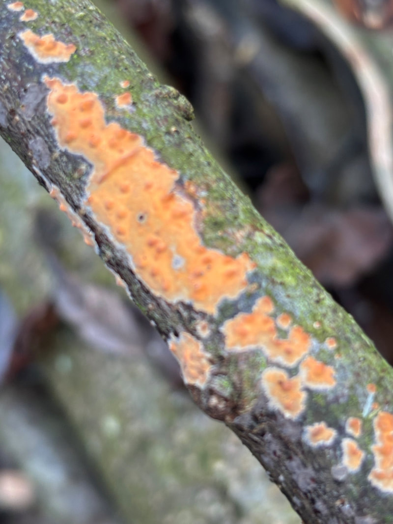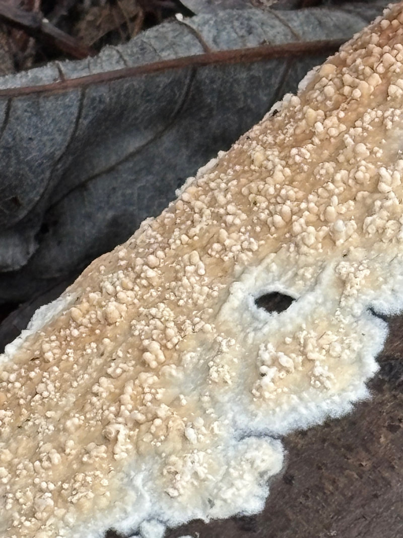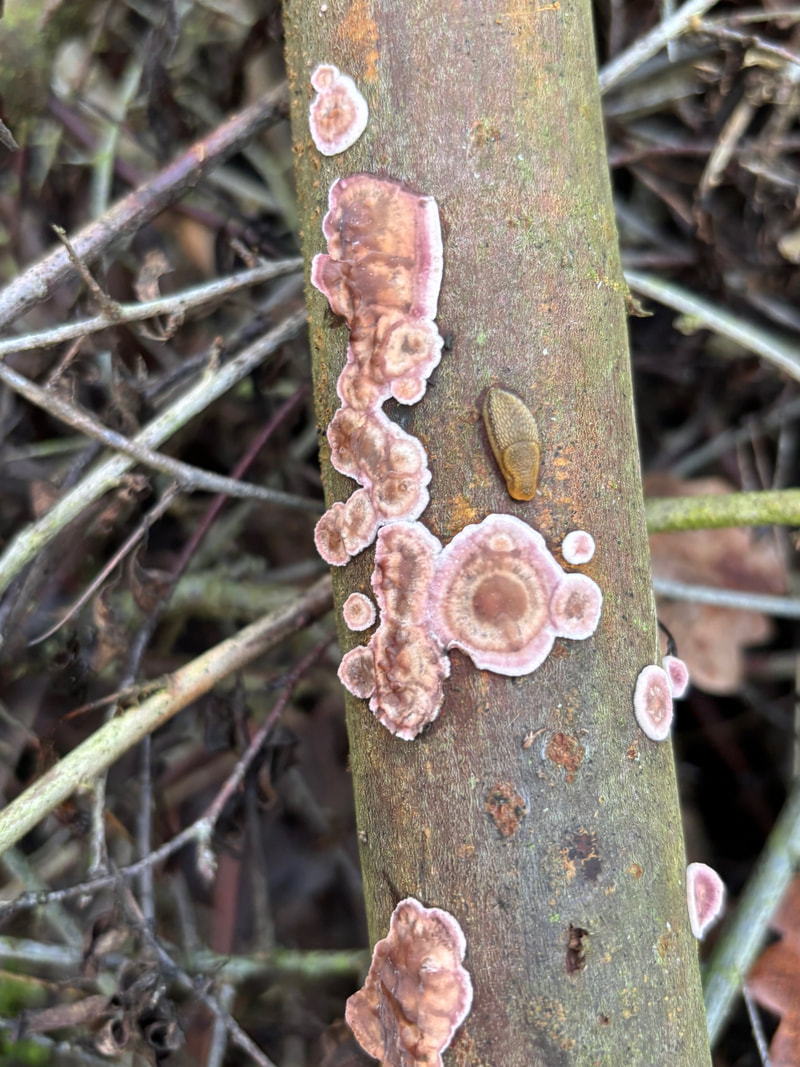1. Crust fungi are mostly applied to the wood surface (resupinate) presenting a variety of colours and textures. They bear spores in fours on specialised hyphal buddings (basidia), naming then takes a while as it's necessary to get a spore print by laying the shaved-off fungus on a slide and waiting a good 24 hours. They are often at their best in winter taking advantage of continued wet, also it's easier to search through the habitat when there's less vegetation like nettles impeding the intrepid mycologist!