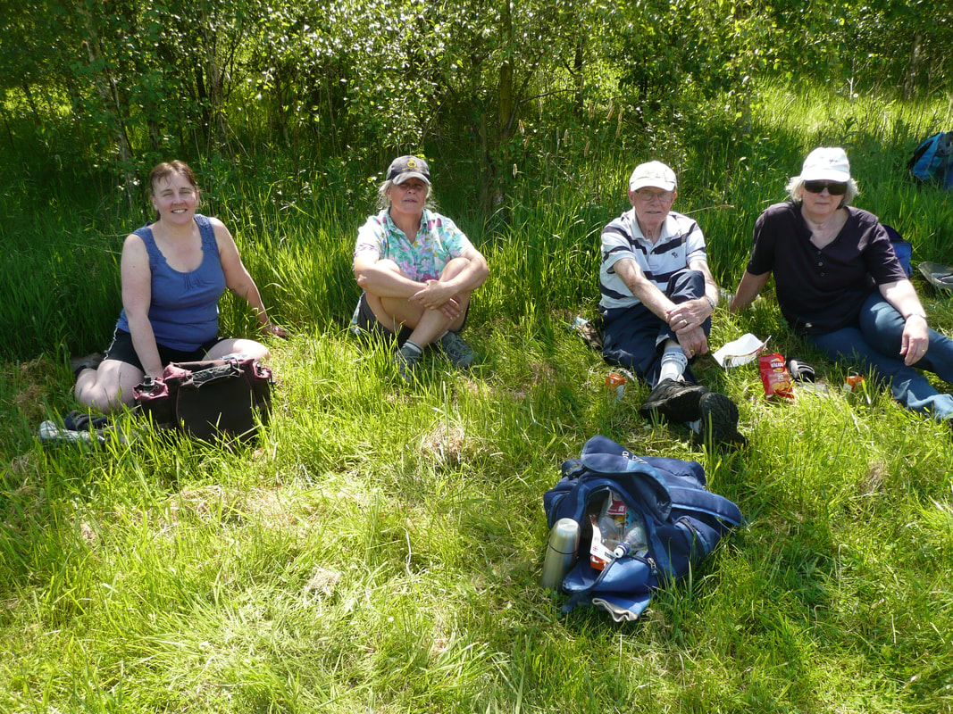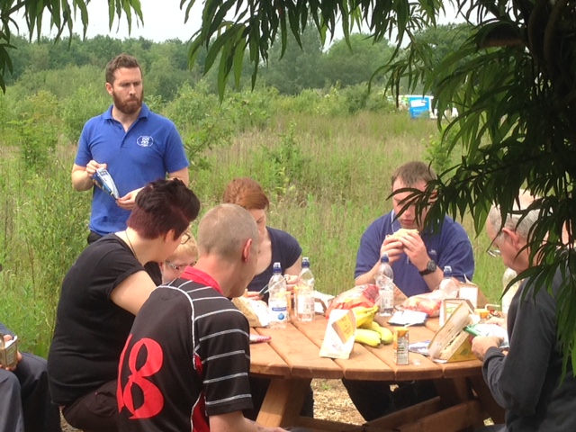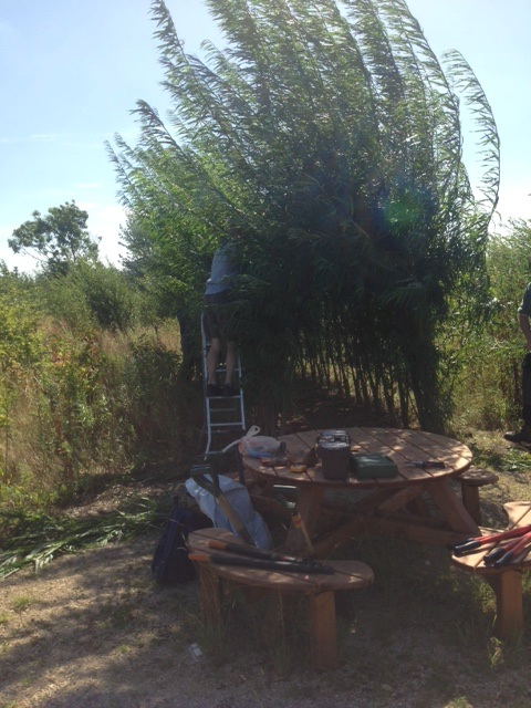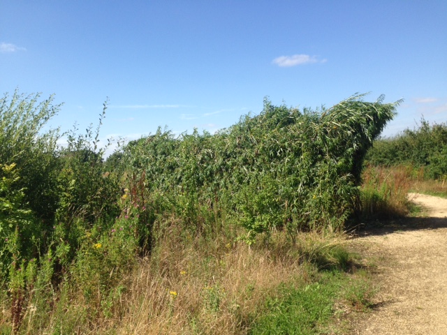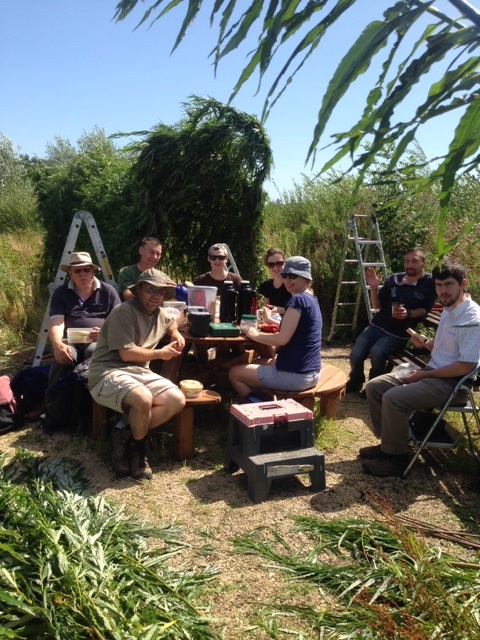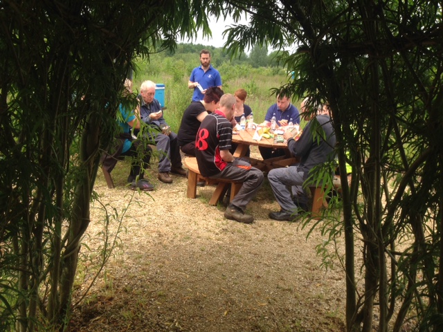 Some artistic types re-stained all the wooden benches and tables. Meanwhile several mighty diggers created new drainage channels leading away from the AAA Derbyshire stone path where it runs parallel to the main grass walk picking up the general downhill drift of surface water. Visitors will know how surprising damp this area can be. And finally a group of perhaps erstwhile hair-dressers gave a good trim to the main willow tunnel, The offcuts, some over 8 feet in length, were planted along a ‘desire line’ used by walkers keen to take a shortcut to the picnic table. Willow is a hardy plant and some of the 66 shoots salvaged from “the barbers’ shop” and replanted just a few metres away might actually take roots and grow in their new location despite the summer heat. And, if they don’t all survive, we will plant again in the more auspicious November-March period. It was a good session under the blue skies and the occasional fluffy white clouds of a quintessentially English summer’s day.