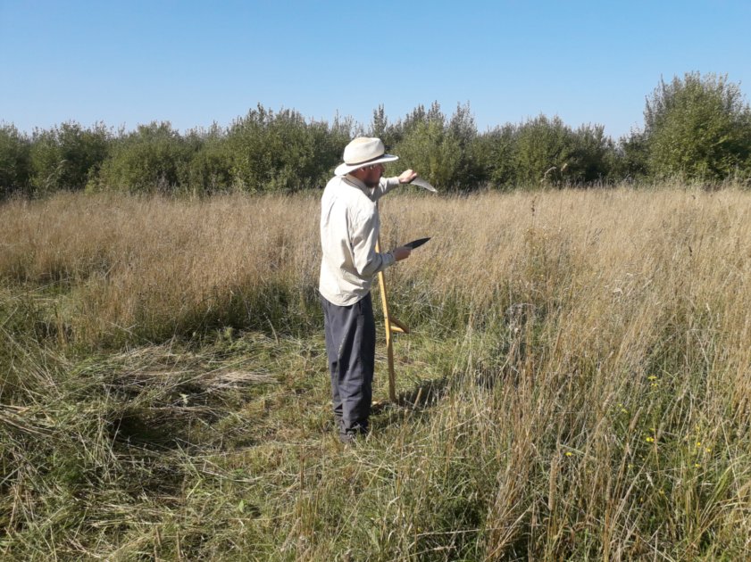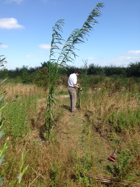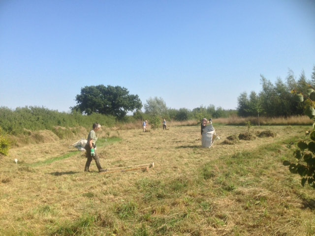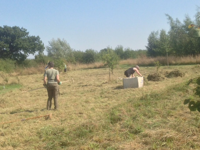It was a great day’s work by about 30 volunteers from the Coop, the Conservation Volunteers and NWT, contributing on average, I would say, four and a half hours. As you know some regular jobs were repeated. The path to our version of the Humber Bridge was mulched and the nursery bed was weeded and mulched. Some new signs were installed. The rapidly growing shrubs and trees close to some paths were lopped off or more gently trimmed back. The surface weed on Beatles Pond was raked off for the first time ever. There was some mowing of small glades and a major haymaking exercise on the Memorial Garden and South Glade, including some of the Conservation Volunteers taking us back to the Middle Ages with their scythes. Wonderful.