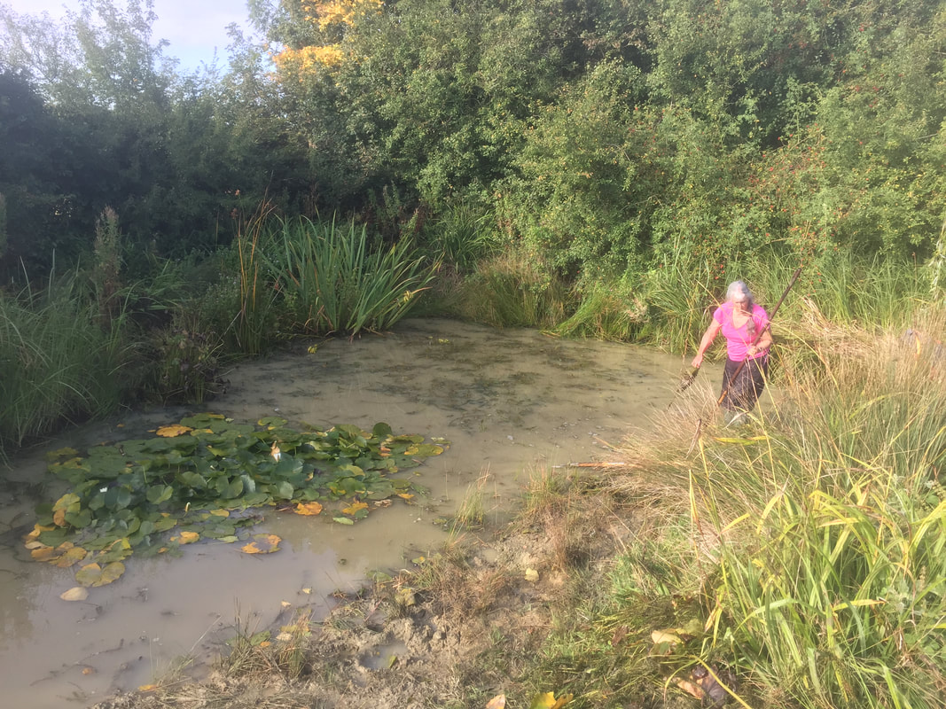 Removing weed from one of the ponds in the Ashing Lane Nature Reserve. This annual task improves the aeration of the water and thus the environment for both flora and fauna. The specialist rake is a crome.