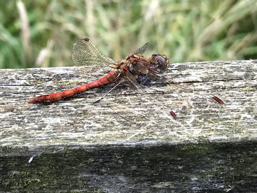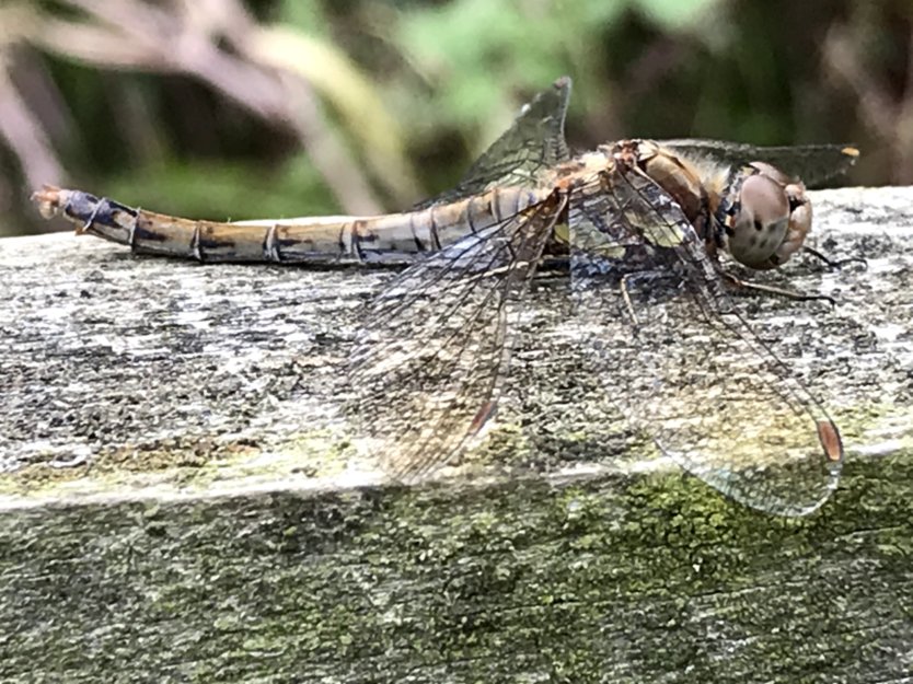 8/11/17 Male Common Darter dragonfly basking on the new 'Touch' interpretive board in the AAA